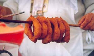 Picarones Ingredientes: 4 ˝ tazas de harina sin preparar ˝ kg de camote 2 cucharadas de azúcar 2 cucharadas de maicena 1 pedazo de zapallo 2 cucharadas de levadura 2 tazas de agua de cocción del zapallo y el camote Aceite para freir Miel 2 tapas de chancaca 3 tazas de agua 1 cucharadita de anís en grano 1 trozo de naranja 1 raja de canela Preparación: Sancochar el camote y el zapallo por separado, licuarlos. En un tazón poner cuatro cucharadas de agua tibia (no caliente) y disolver la levadura y el azúcar, dejando reposar por cinco minutos. Agregar la harina y la maicena previamente cernidas, el zapallo, el camote y el agua. Batir con fuerza. Cubrir la preparación y dejar reposar en un lugar agregando hasta que la masa levante. Colocar abundante aceite en una olla o perol y cuando esté caliente, formar roscas con la masa y freír. Mojarse los dedos ayuda manipular la masa. Miel: Picar la chancaca y poner en una olla al fuego con los demás ingredientes hasta que se forme una miel. Colar y servir sobre los picarones. |